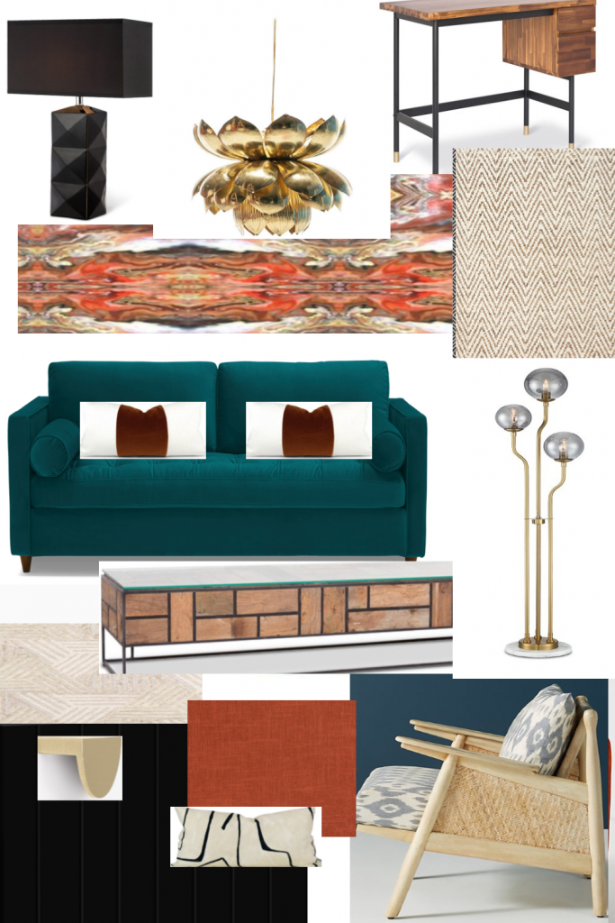 Moodboard for the Guest/Office portion. Pictured is the Calder Coffee Table, the Bardot Floor Lamp and the Midtown Desk.