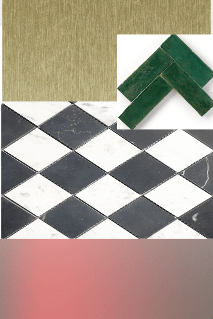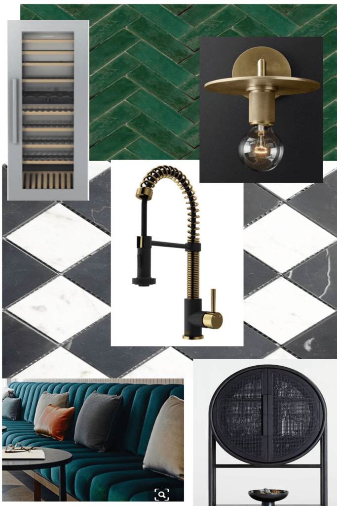 The next thing we settled on was the color scheme. Since I wanted this to be a sexy, dark, moody space, we’ll be working mostly in deep emerald greens and blacks. I’ll be offsetting those hues with some brass tones and likely a touch of blush. The sconces (pictured on the moodboard) by LETIFLY will be the perfect complement to the rich green hues. And the stunning black and brass faucet you see above? That beauty, along with the sink, will be provided by VIGO Industries. We’re working with RIAD‘s luxurious Zellige tile in green, which will be used as a backsplash behind the counter. To finish off the color scheme, the ceiling will be Locally Grown by Magnolia Home paint, a deeply saturated green with olive undertones.