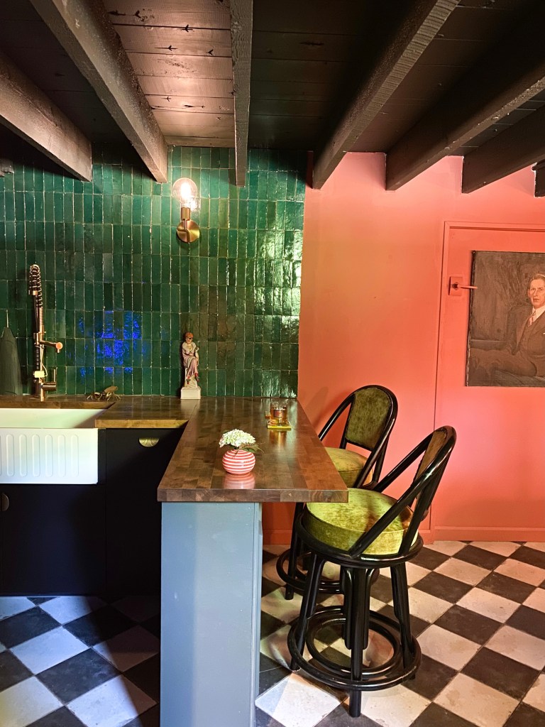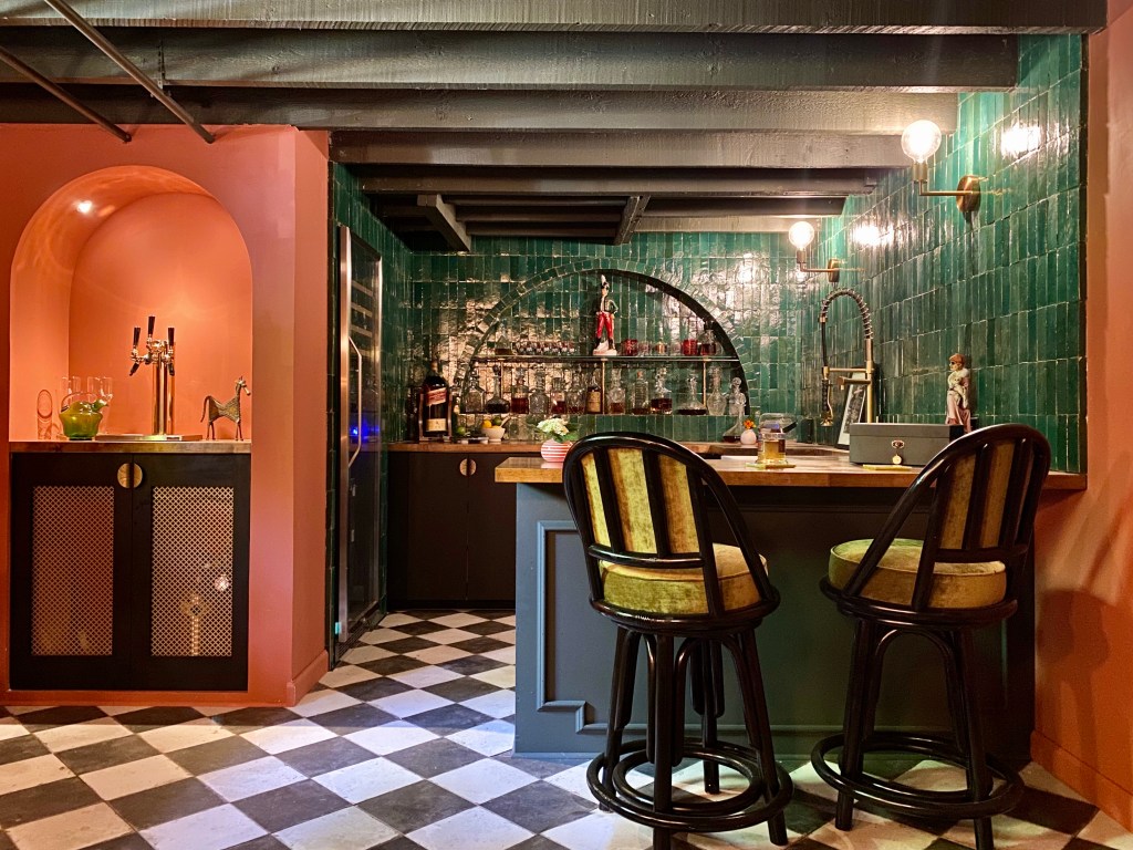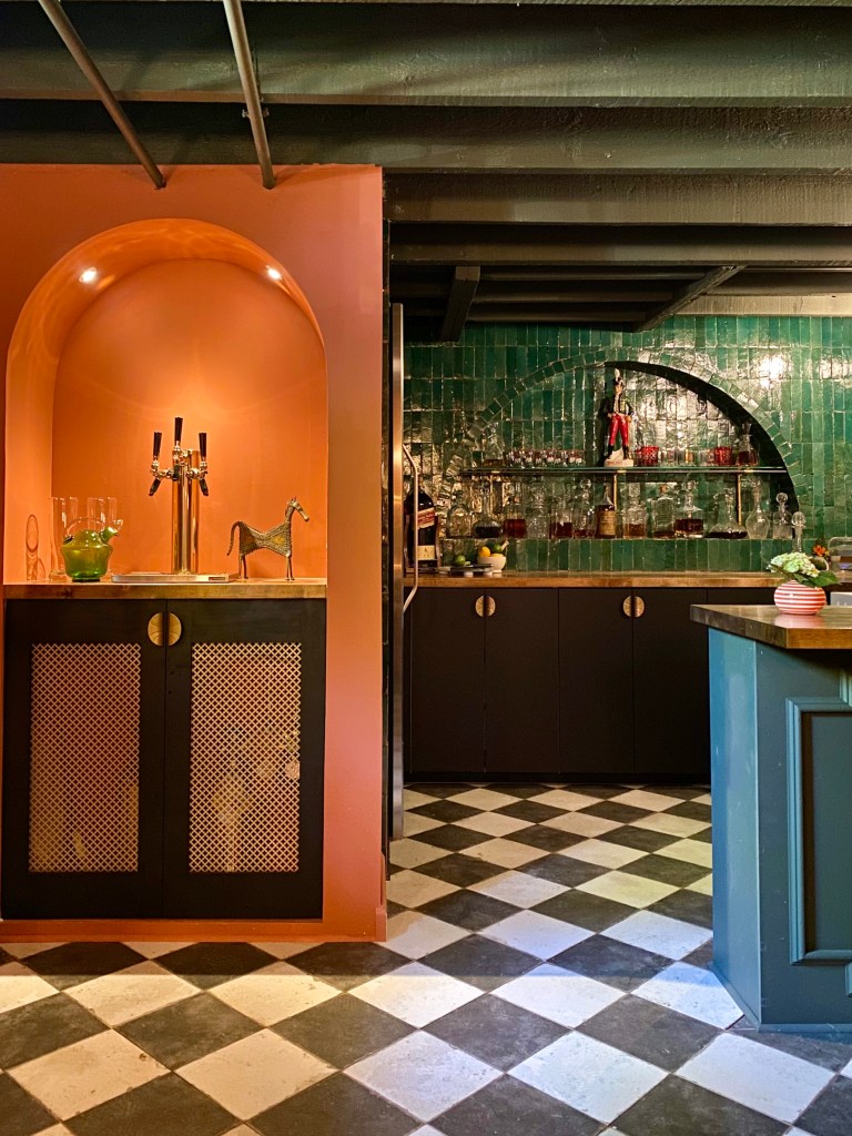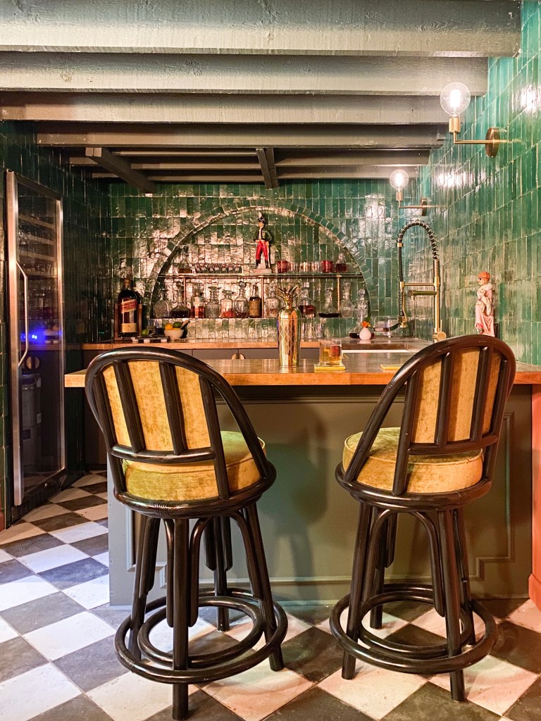 The bar was meant to really be the focal point of the room, with the stunning finish of Riad’s green zellige tile serving as the backdrop for an arched enclave of shelving. The shelving was styled with vintage decanters and glassware that I have been picking up for Billy for YEARS at estate sales. It feels good to finally have a spot for them to shine.