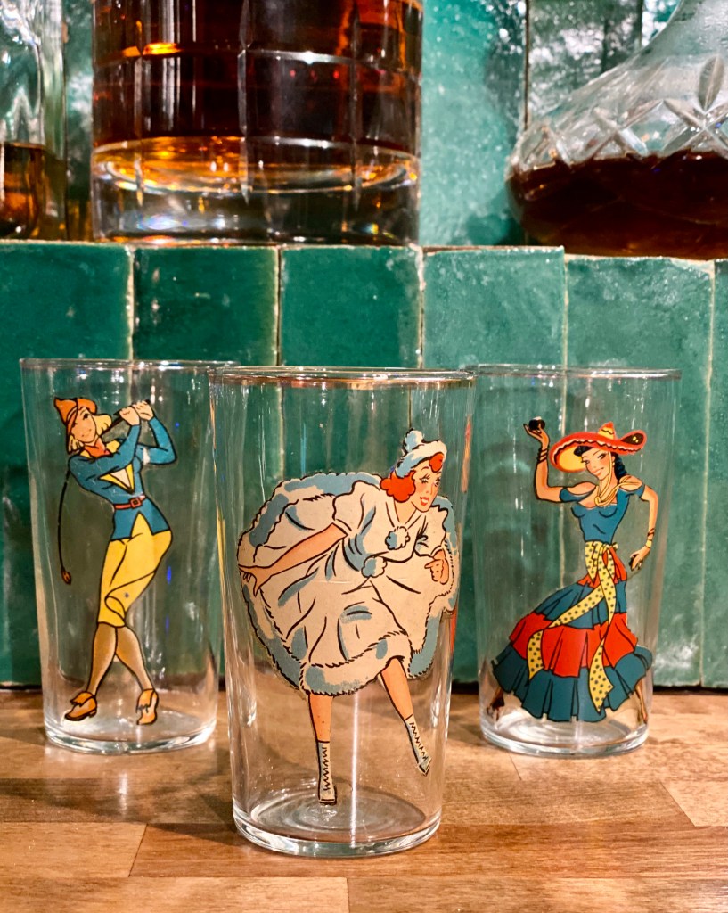 Nearly everything you see on these shelves is vintage, but the one piece I couldn’t resist picking up for this space is this Pineapple Cocktail Shaker from Anthropologie. I had sold nearly all my vintage decanters (yes, I am full of regrets), and the only one I had left was only large enough for a single drink (peep it on the shelves). These vintage peek-a-boo glasses (see below) hail from the 1950s. They’re some of my most treasured items, and I’ve only ever found three out there in the wild (and I spend a lot of time in the wild).