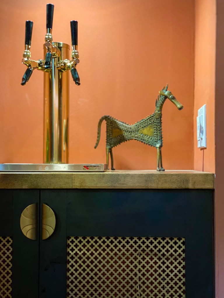 We carved this arched area out to host the taps, and to mimic the arch of the bar area. We matched the countertop in the same butcherblock countertop as the rest of the speakeasy, and custom built the cabinet doors below. It was a fairly straightforward DIY. We ordered some clover metal grate off of Amazon and attached it to the back of wood we cut to size and painted black. The halfmoon hardware was a vintage score off of ebay that we simply spray painted in an antique brass. The color on the walls is “Baked Terracotta” by Benjamin Moore. And the exposed beams we spray painted using a gun and Magnolia Home’s “Locally Grown” paint.